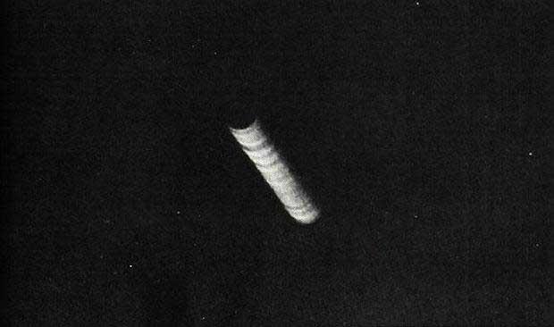 This cylindrical-appearing UFO was photographed over New York City on March 20, 1950.